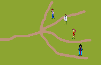 A tourist on the island wanted to visit the lighthouse and set off down the road. Shortly, he came to a four-way fork and didn’t know which way to turn. But, as the tourist agency had told him in advance, he would find four island residents, each standing by one of the four roads. He could ask them for directions to the lighthouse.