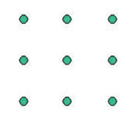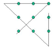 Draw a continuous line, made up of no more than four straight segments, that goes through all of the nine dots.
