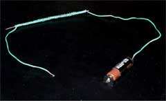 The wire is wound around a straightened paper clip and is attached to one end of the battery. When the loose end of the wire is touched to the other end of the battery, electricity flows through the wire and the paper clip becomes magnetized.