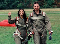 We were in a massive cloud, and began to descend at a much slower speed. Gradually, the bright blue sky was revealed. This was good. I was still alive. Whew! From then on it was heavenly, with the parachute fully extended, we floated down, taking in miles of fall scenery below. I felt completely relaxed, listening to the wind and feeling like a bird. We spent the rest of the day recalling the fun and planning our next jump in the spring.