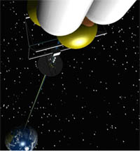 © HighLift Systems Building the Space Elevator: A satellite drops a nanotube ribbon toward earth. The elevator will climb up and down this cable. |