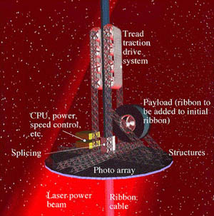 Robotic climbers powered by a laser beam aimed up from an earth station would travel up the ribbon adding more nanotube fibers to it for greater strength.