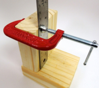 1. Attach the two pieces of wood together with nails or screws to make an L-shaped base. Set it on a table with one side horizontal and the other side upright. Then, clamp the metal strip to the upright piece of wood so that the strip is vertical, as shown in the photo. Make sure the clamp is at the top of the wood; this will ensure that your results are accurate.