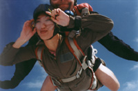 We were in a massive cloud, and began to descend at a much slower speed. Gradually, the bright blue sky was revealed. This was good. I was still alive. Whew! From then on it was heavenly, with the parachute fully extended, we floated down, taking in miles of fall scenery below. I felt completely relaxed, listening to the wind and feeling like a bird. We spent the rest of the day recalling the fun and planning our next jump in the spring.