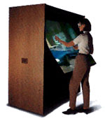 The Immersadesk is a VR console that creates a sense of being inside the environment displayed on the screen. The user wears active glasses that produce the stereo effect, and a little transmitter, which signals the system as to head position and orientation to display the appropriate image.